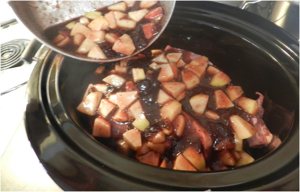 2 cans of whole-berry cranberry sauce ½ cup pure maple syrup ½ cup brown sugar 2-3 chopped apples that cook well (Fuji is my current favorite thanks to the Stein family!) 1 TBSP Dijon mustard 1-2 tsp. cinnamon ½ of a red onion sliced 3-4 lbs country style pork ribs (I’m sure beef would be good too.)Put everything but the meat and the onion into a sauce pan and heat it until it’s simmering and the sugar is nicely dissolved.
