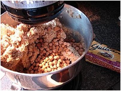 Mix butter and sugars. Add eggs and vanilla and mix again. Dump in the dry ingredients and try not to let fly. When you have a stiff dough, add the chips. Bake at 365 degrees for 13-15 minutes. Be careful not to over-bake or they turn into rocks. (For complete directions see: Ku-Ki-Do 101 )
