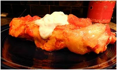 Sauce: Before I start the filling, I begin heating the tomato sauce, chili powder and cumin in a pan. It just needs to get hot before you add the cornstarch dissolved in water to thicken it. (I don’t understand why you have to dissolve the cornstarch in water, but you do. It stays grainy and gross if you dump it straight in – kind of like cornmeal in chili.)