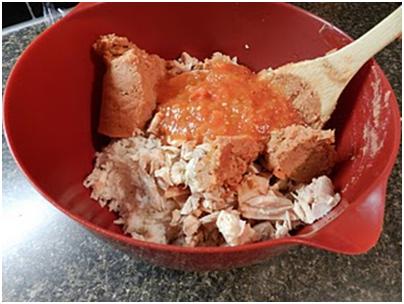 The filling is simple. I don’t have the patience for artistic layering of ingredients into tortillas. I plop it all into a bowl and stir it together. The salsa and enchilada sauce go in last so that I can make sure not to add too much. Indiscriminate dumping can turn the whole project sloppy.