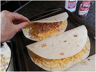 Ingredients: Tortillas, shredded cheese and chopped chicken (left over from the two rotisserie chickens that ended up in pot pie and enchiladas)