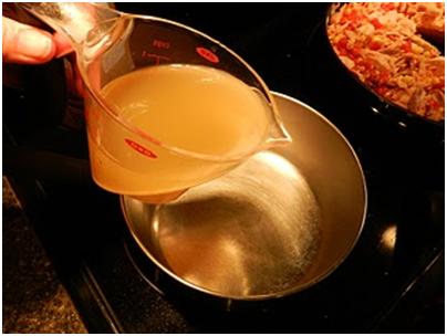 One and a half cups of chicken broth combined with about half of that can of spicy El Pato salsa made the sauce that would be poured hot over the top of all the layers. I put it on the back burner on medium heat while I finished working on the rest of the dish.