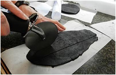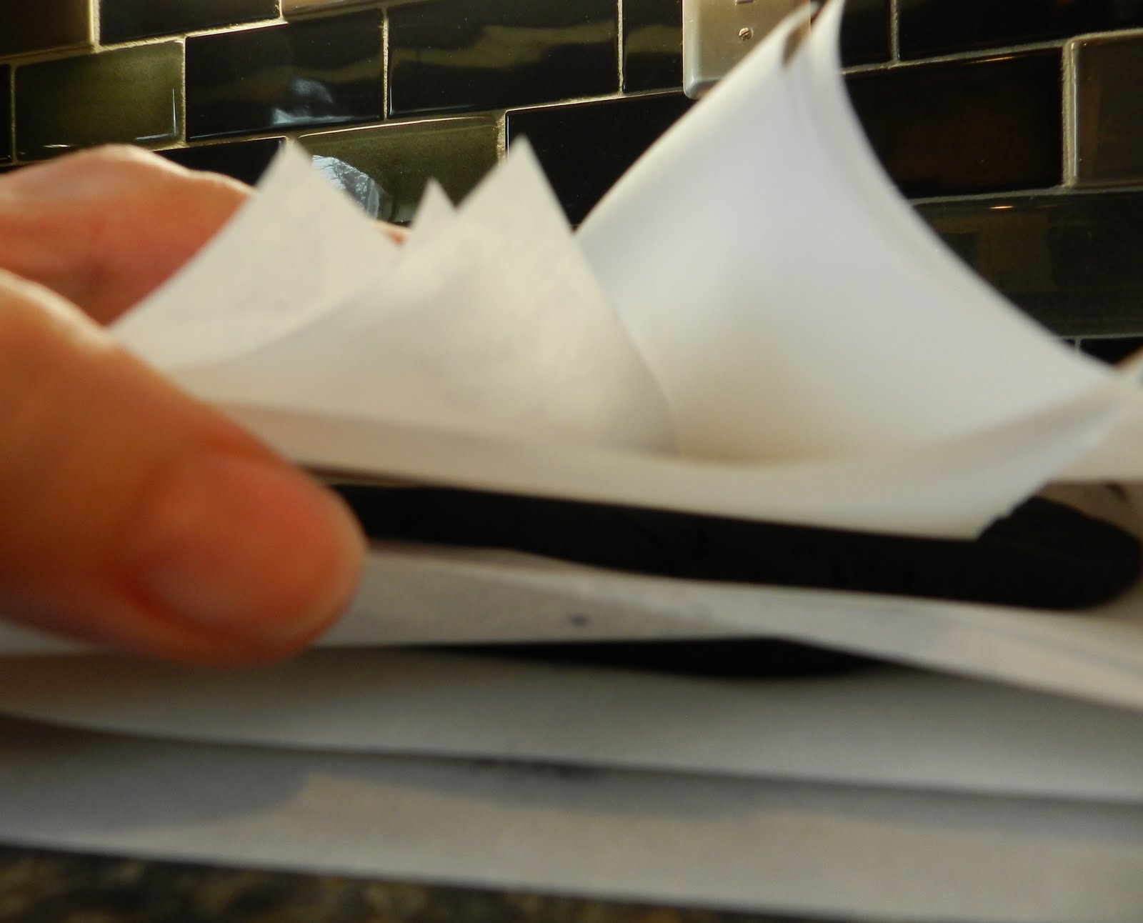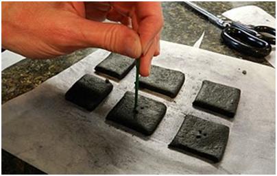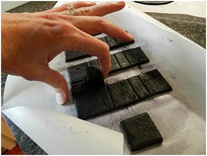 Use a pizza cutter to form a grid of one-inch squares for the caps, with smaller lines of buffer dough between each row of caps. The buffer will be peeled away from between them and the caps will not leave their place on the parchment paper until after they have been baked. With cookies this thin, it is almost impossible to move them without mutilating their shapes.