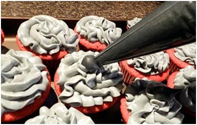 Color the remaining frosting to the main color you’ve chosen. I made gray by adding a small amount of black Wilton gel food coloring. Gel food coloring is critical for frosting because it doesn’t mess with the consistency like liquid.