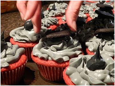 For the last three years we’ve coordinated the university ministry for our church and when it’s graduation time we have an open house with cupcakes for our grads. Washington State’s colors are “Crimson and Gray” so red velvet cake with gray cream cheese frosting works beautifully. The caps are made of little cookies with frosting tassels perched on a dollop of black frosting.