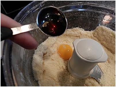 Process again. It will get to a crumbly state like this. Then you can add the food coloring.