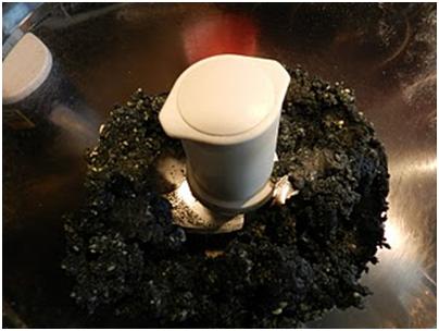 Add water a few drops at a time through the food processor’s feed tube until you get a ball of dough like this.