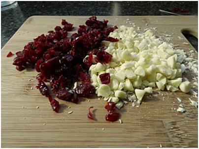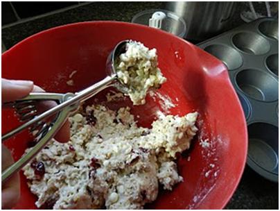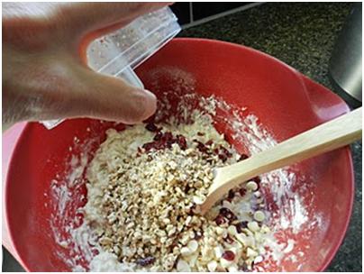 Once the dry and wet have been delicately combined, you can add goodies. For this batch, I used about ¾ cup each of chopped white chocolate chips, chopped dried cranberries, and finely chopped walnuts.