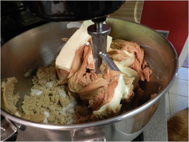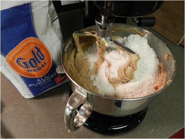 With peanut butter dough, the rules of great Ku-Ki-Do still apply. It has to be stiff enough to pull away from the mixer bowl into a chunk without a spatula or the cookies will be like pancakes. Sometimes with peanut butter you have to add more flour than the basic recipe calls for because not all peanut butters are alike.