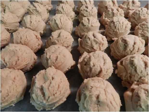 When the dough is the right consistency, go ahead and form balls just like you do with other cookies and line them up on waxed paper. I love rows of Ku-Ki-Do!
