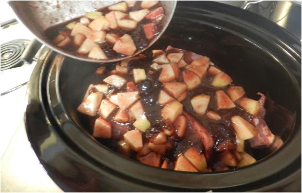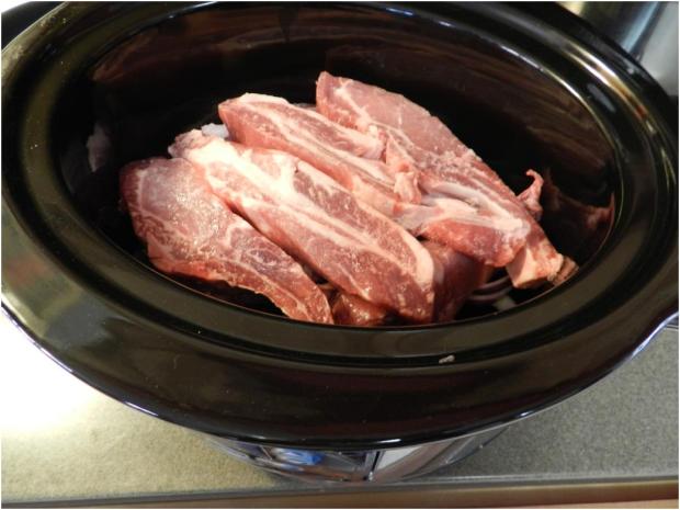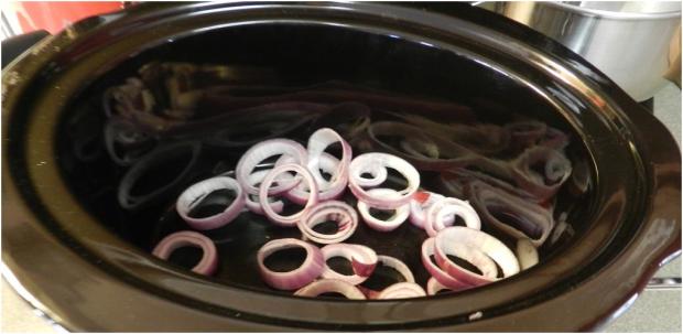 Meanwhile, toss the sliced onion and the ribs into the crock pot.