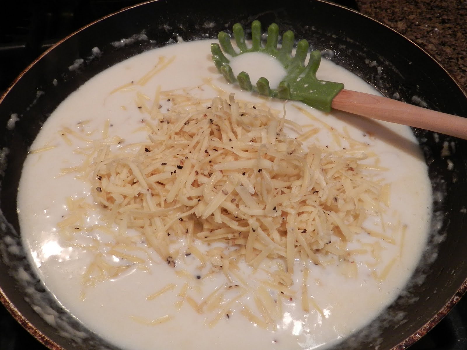 Mix the Alfredo sauce with the milk. I usually pour the sauce out into a bowl and put the milk into the empty jar, reseal it, and shake it to get the last of the Alfredo out of the jar. This is the first step in the process of prepping for the recycle bin.