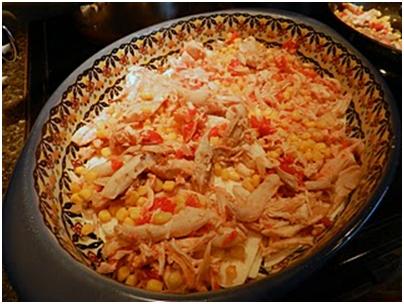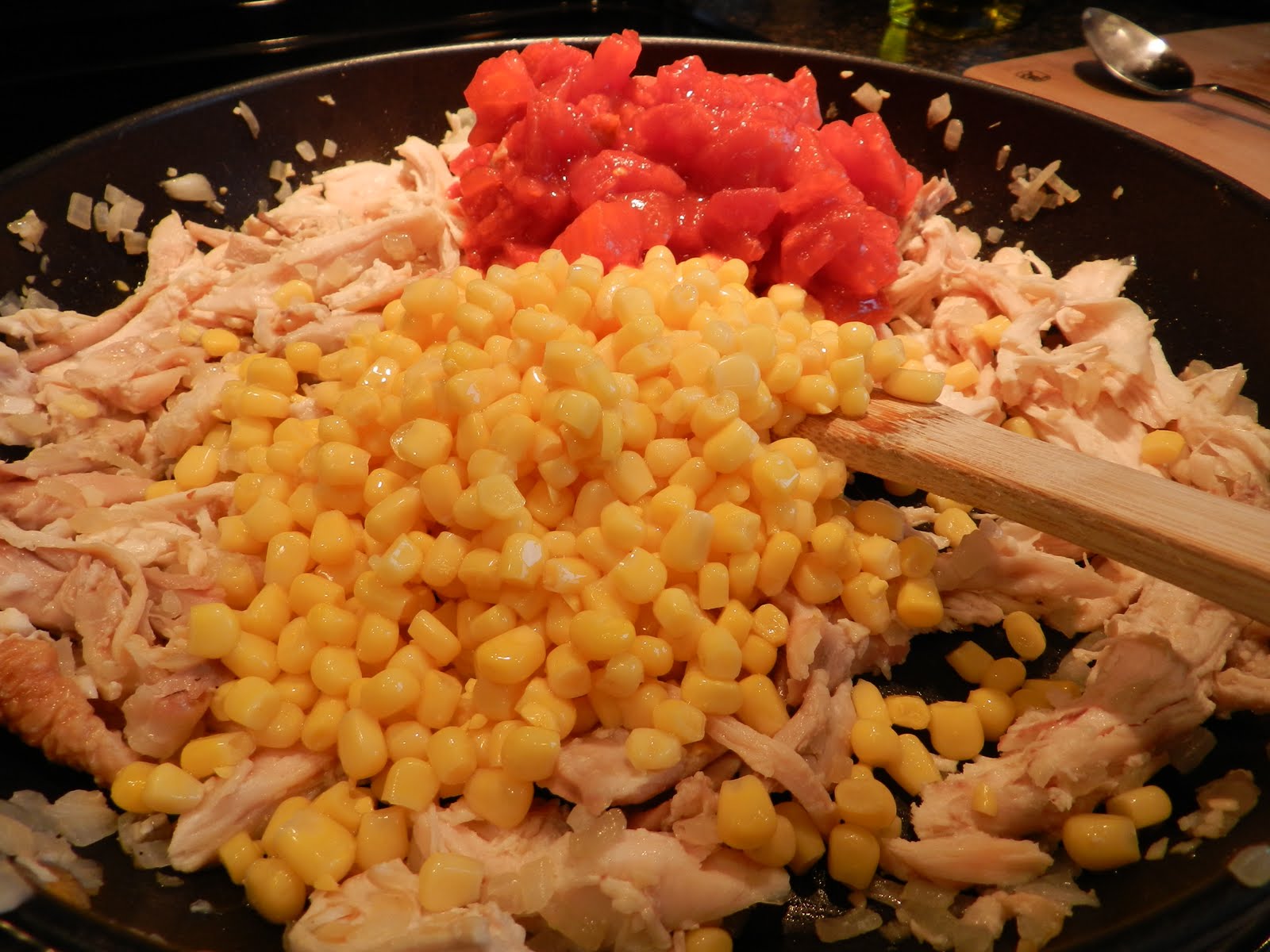 Then I dumped half of the corn, tomato and chicken mixture in and spread it around.