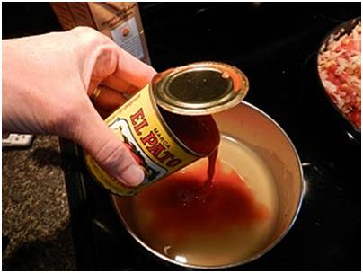 One and a half cups of chicken broth combined with about half of that can of spicy El Pato salsa made the sauce that would be poured hot over the top of all the layers. I put it on the back burner on medium heat while I finished working on the rest of the dish.