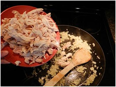 By that time the garlic and onion were heated through and softened. I added the shredded chicken and stirred periodically until it was hot.