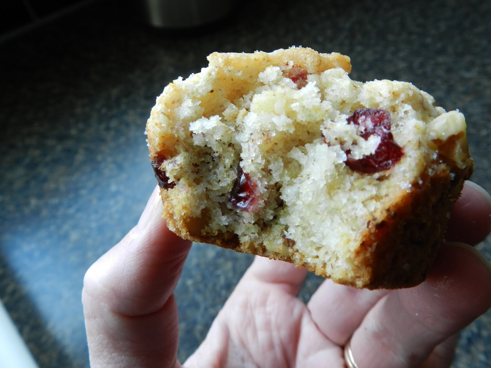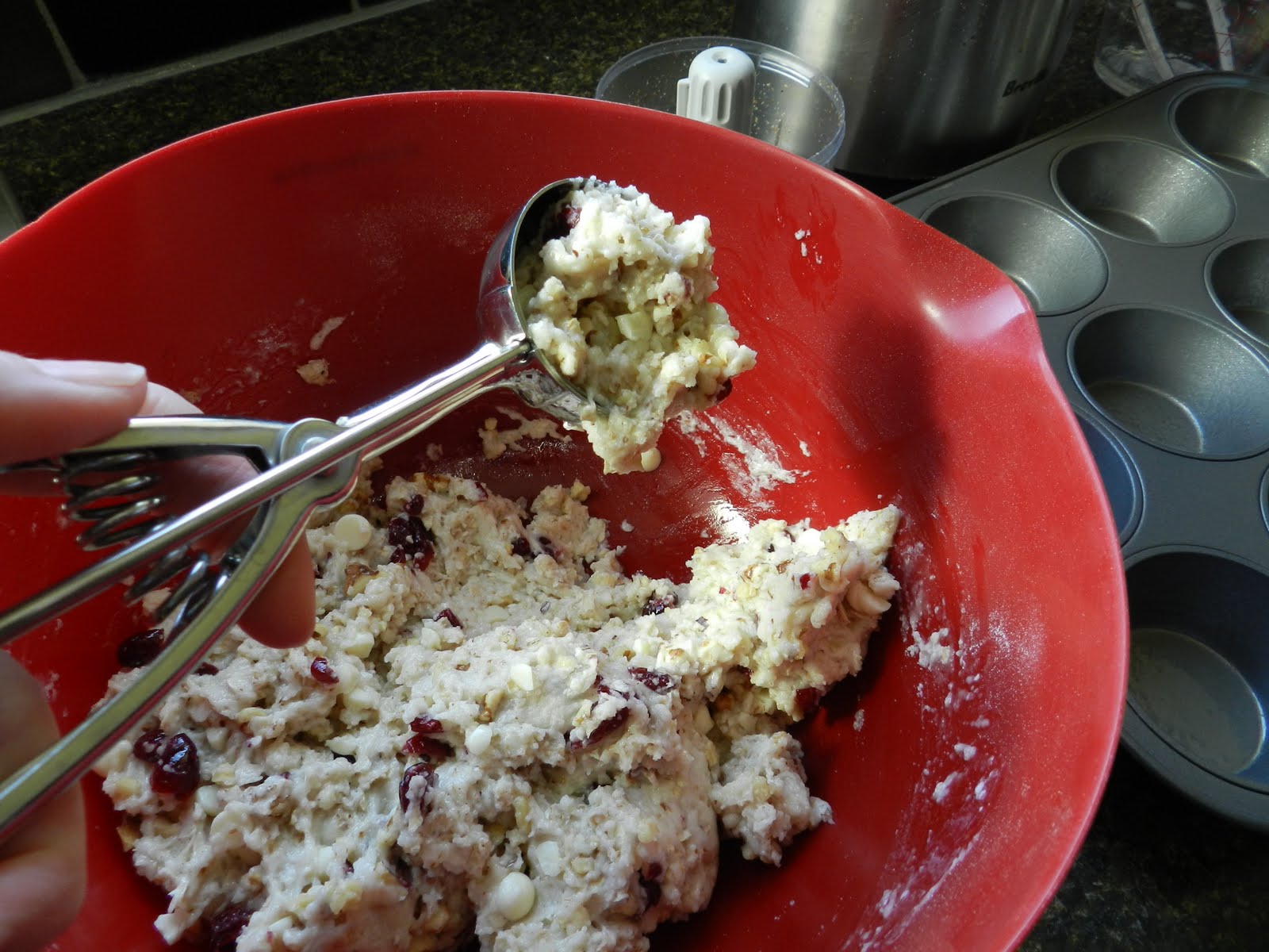 Once the dry and wet have been delicately combined, you can add goodies. For this batch, I used about ¾ cup each of chopped white chocolate chips, chopped dried cranberries, and finely chopped walnuts.