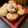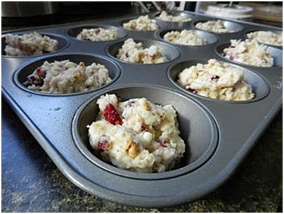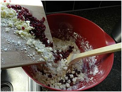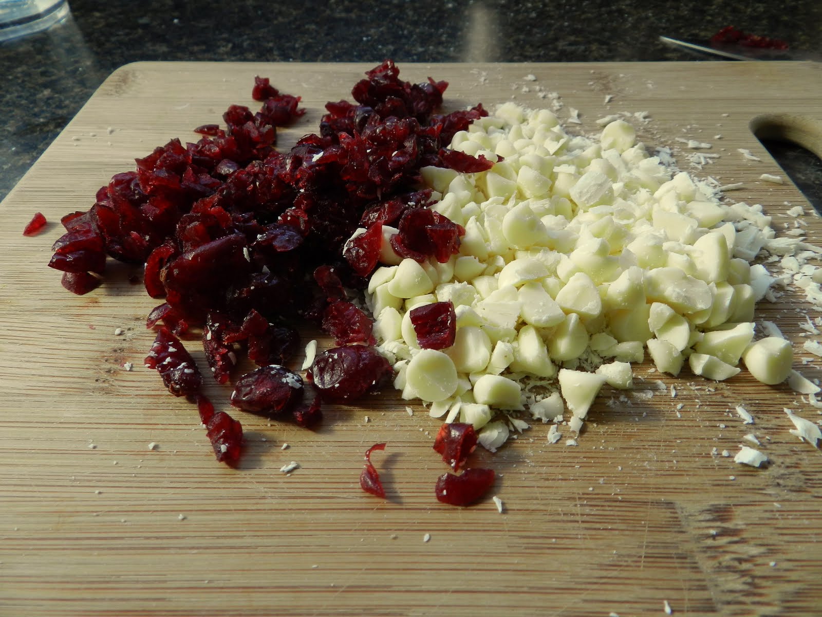 Once the dry and wet have been delicately combined, you can add goodies. For this batch, I used about ¾ cup each of chopped white chocolate chips, chopped dried cranberries, and finely chopped walnuts.