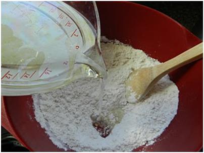 Muffins are the reverse of cookies. You start with the dry ingredients then add the liquid. (For this particular batch that second cup of dry stuff was quick oats.)