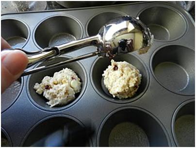 Scoop the batter into a muffin tin sprayed with non-stick spray. You can use papers, but I never seem to have them in the cabinet – possibly because my boys often chew them like little goats when they’re done with each muffin and it grosses me out.