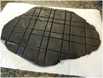 Use a pizza cutter to form a grid of one-inch squares for the caps, with smaller lines of buffer dough between each row of caps. The buffer will be peeled away from between them and the caps will not leave their place on the parchment paper until after they have been baked. With cookies this thin, it is almost impossible to move them without mutilating their shapes.