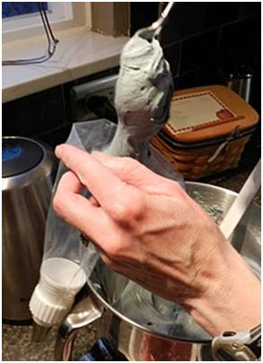 Next I put on the base of the cap with a pastry bag that just has the tip cut off. Sandy and Susie taught me this tip-less trick while we were working on the Victorian Tea together. You get the cutest little dollops.