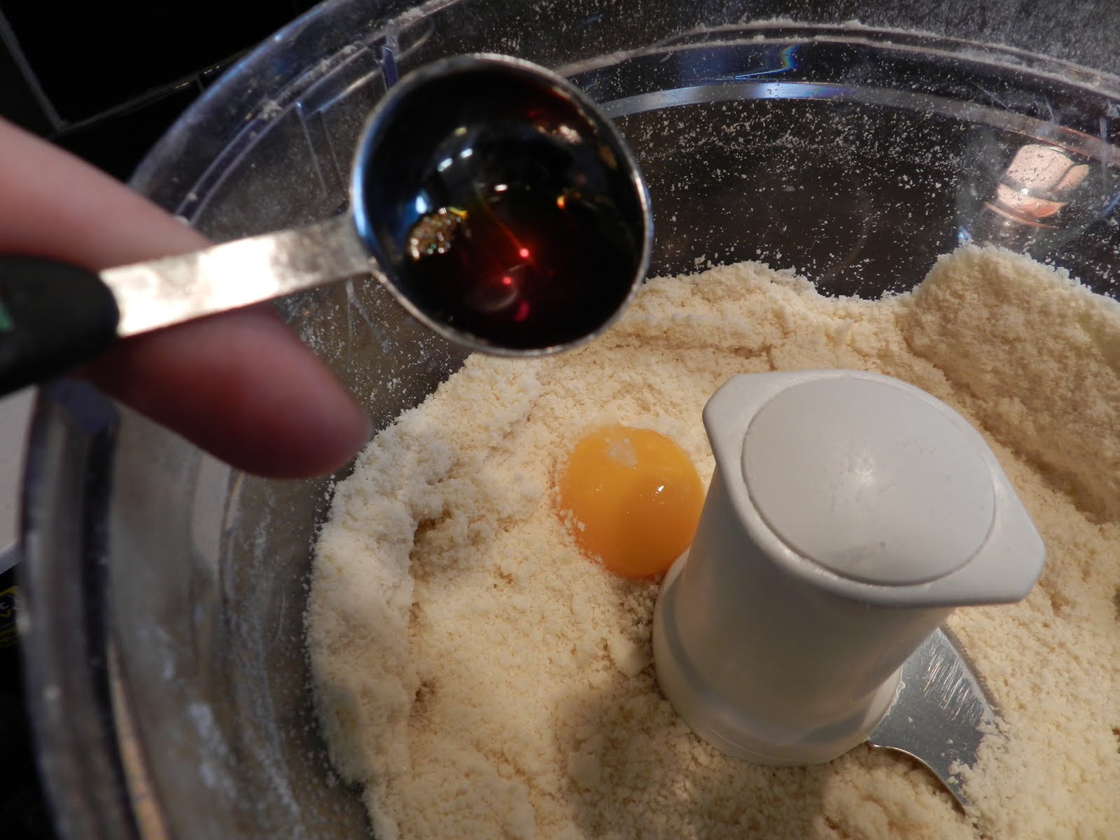 Process again. It will get to a crumbly state like this. Then you can add the food coloring.
