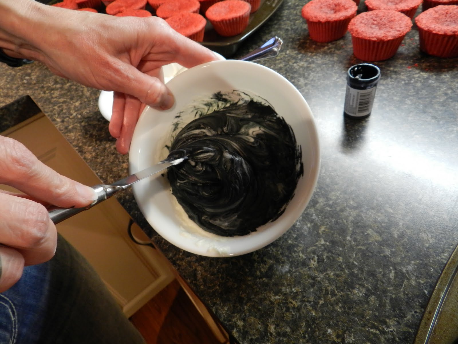 Once they are cool, use your clean fingers to rub off the inevitable crumbs that will be stuck around the edges. Set them aside to wait while you go on to the cupcakes. The cupcakes can be any kind you want to make. If you want to hear about the escapades involved in making mine, go to…. Lessons in Red Velvet.