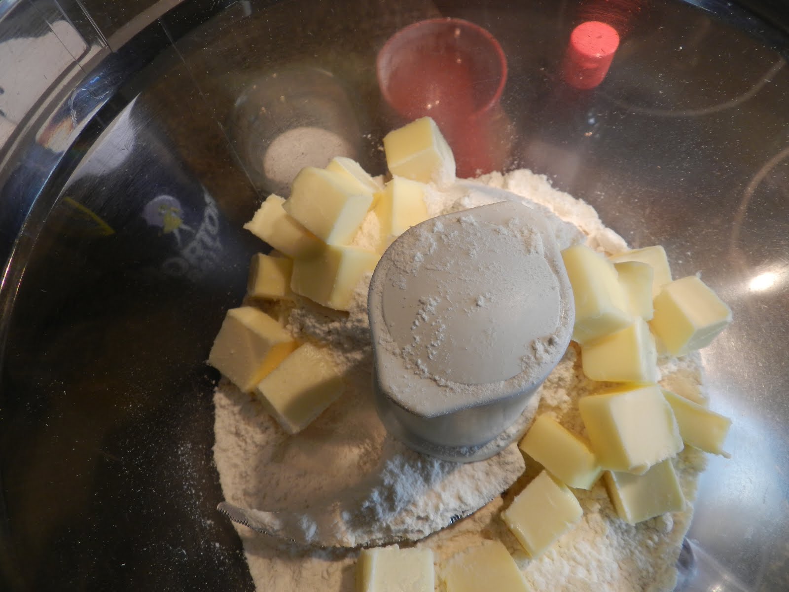 Cut the butter into cubes and drop them into the food processor with the flour and pinch of salt.